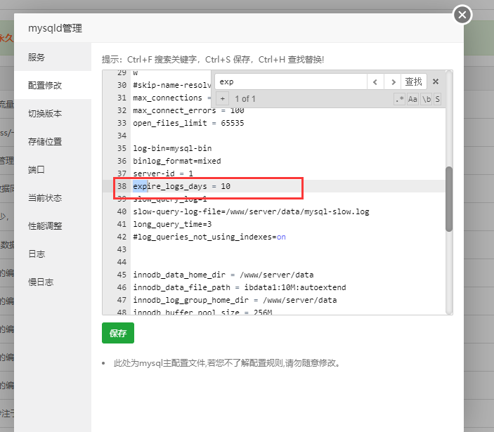 不过宝塔官方的回答是这样的,但是个人也遇到过几次,有时候安装的会有时候安装的宝塔就不会出现这问题。如果不需要日志功能就在MYSQL的修改配置里面,找到log-bin =mysql-bin把他注释掉。这样#log-bin=mysql-bin