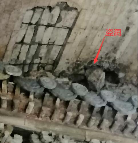 这个墓曾经被盗严重,目前仍然可以看到墓顶有一个石头封堵的盗洞,而在这个盗洞下方就刚好有一具尸骨,而在棺椁中的才是墓主人,这个显然不是墓主人的。据推测可能是一起盗墓的人,同伙想把金银财宝独吞,所以在把财宝递上去之后,同伙就把对方杀害并且用一块大的条石封堵了盗墓口。现在还可以看到那块封堵的条石。