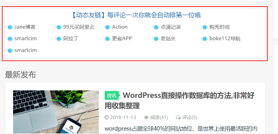 如果你发表了评论,你的网站链接就会展示在第一个位置,动态变化的,又是在首页显示,所以我给他取个名字叫动态友链,类似于抢排名的道理,这样可以明显增加自己网站的人气和访问深度,访客的行为和粘性都会提高很多的,感觉不错我就自己写代码做了一个。