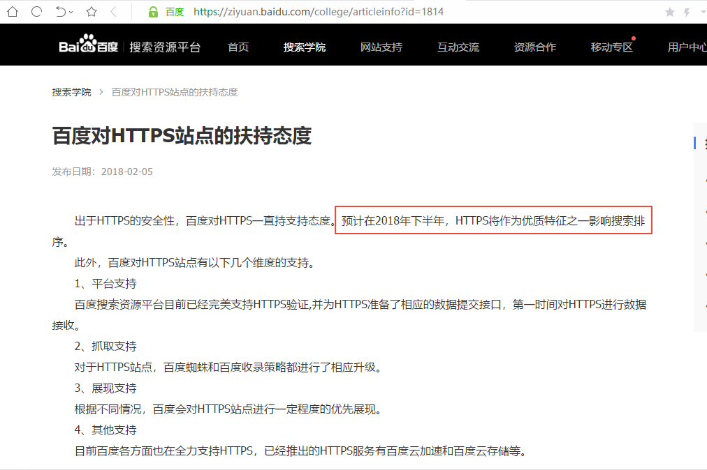 出于HTTPS的安全性,百度对HTTPS一直持支持态度。预计在2018年下半年,HTTPS将作为优质特征之一影响搜索排序,根据不同情况,百度会对HTTPS站点进行一定程度的优先展现,对于HTTPS站点,百度蜘蛛和百度收录策略都进行了相应升级,seo优化更容易,收录更快速。