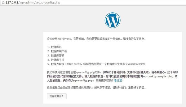 2、在浏览器里访问//你的本地域名/wp-admin/setup-config.php,出现wordpress安装界面,如上图所示,然后点击“现在就开始!”安装按钮;