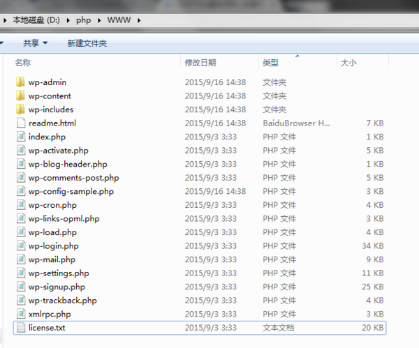 1、将wordpress程序压缩包解压出来,并且放到本地的根目录下,也就是文件夹名为“www”的文件下,如上图所示;