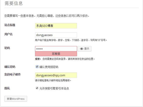 5、填写好我们的基本信息,然后点击“安装wordpress”按钮;