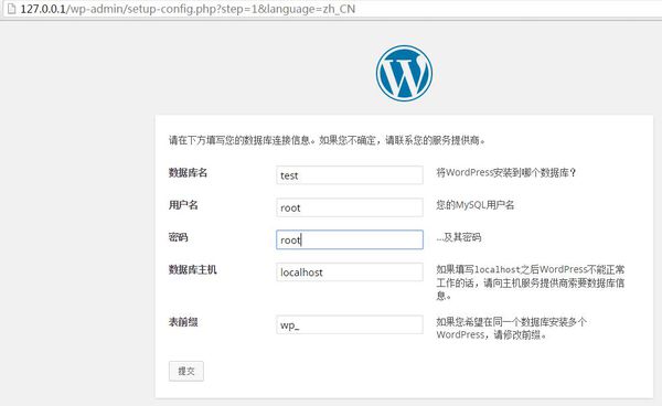 3、配置wordpress本地安装数据库信息,由于我们使用的是phpStudy来搭建的本地PHP环境,所以数据都是默认的,数据库名:test;MySQL用户名:root;MySQL:密码:root;数据库主机:localhost;表前缀:wp_;将以上信息填入后,点击“提交”按钮;