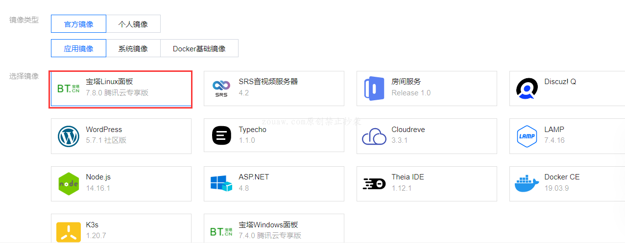 四、应用镜像也是可以选择的,不过个人并不是很推荐大家安装,常见的应用镜像比如宝塔Linux面板,WordPress,Docker CE,Node.js等镜像也是可以选择的,但是如果你不熟悉的话,可能安装好之后反而不好,可以优先考虑安装和使用系统镜像,安装纯净的操作系统镜像。