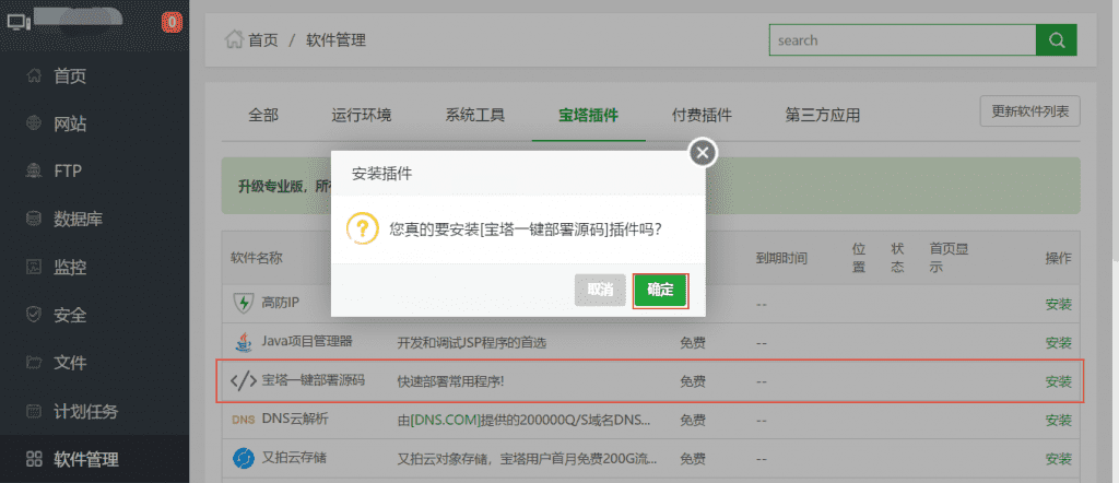 1、首先在宝塔的后台找到软件管理-宝塔插件-宝塔一键部署源码插件,然后点击安装即可;
