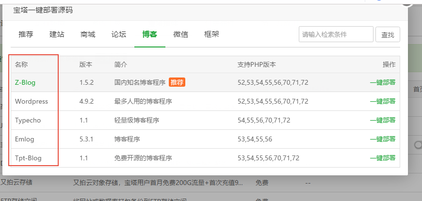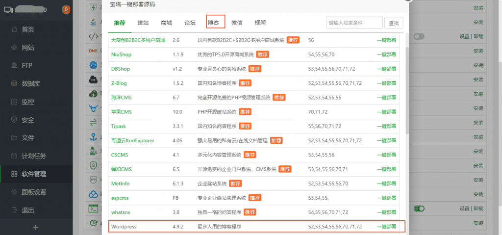 2、宝塔一键部署源码插件安装好之后,可以直接点击宝塔一键部署源码插件,选择你喜欢的源码一键轻松部署和安装就可以了,比如里面有非常多的网站源码,包含了商城论坛和博客等等;