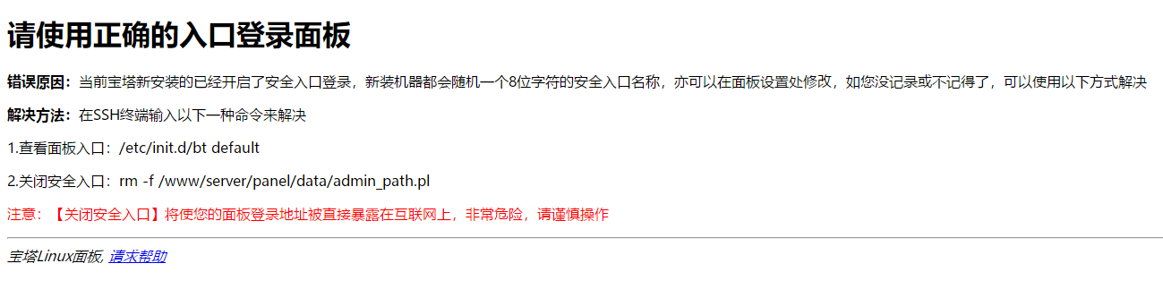 错误原因:当前宝塔新安装的已经开启了安全入口登录,新装机器都会随机一个8位字符的安全入口名称,亦可以在面板设置处修改,如您没记录或不记得了,可以使用以下方式解决