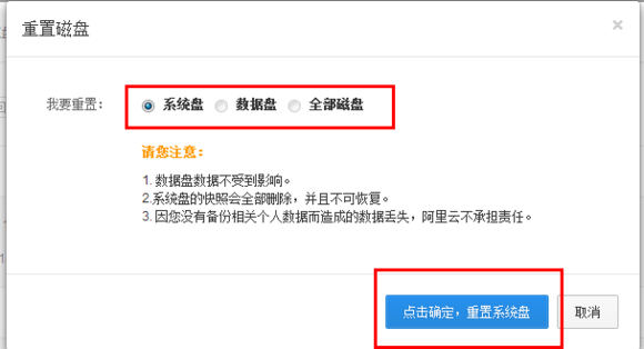 2、根据需要选择重置系统盘,数据盘,全部磁盘,选择后点击确定,重置您所需要的盘