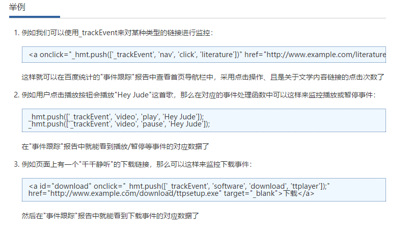 里面有使用方法和示例,我们可以跟着做就行了,对于稍微有些程序前端基础的应该是比较简单的,一看就懂,不懂的也没关系可以照着做。就是给每个元素绑定一个事件,当点击的时候出发发送数据给百度统计,然后就可以在百度统计后台的事件分析看得到数据了。
