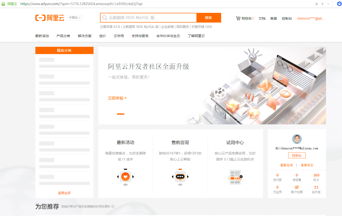 阿里云首页改版了,你觉得怎么样?近期发现阿里云不管前台还是后天都改版了不少东西,logo颜色等等改变,其实阿里云首页也是改版了的,估计是改动太大没有完全铺开还在测试阶段吧,所以部分用户可以看到新版。以下是新版的截图,大家觉得怎么样呢?