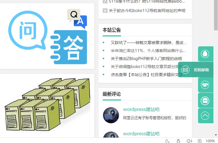 boke112导航右侧的工具条感觉还是不错的,体验和各方面来说的话确实可以的,今天就把这个代码抠出来分享给大家吧,我自己的网站暂时是没有添加的,不过确实比较实用,一些主图咨询,联系合作的功能拼合在一起的话还是挺好的。感觉好多的wordpress站点的侧边栏还是会漂浮一些这类如咨询之类的工具的,废话不多说了直接进入主题吧。