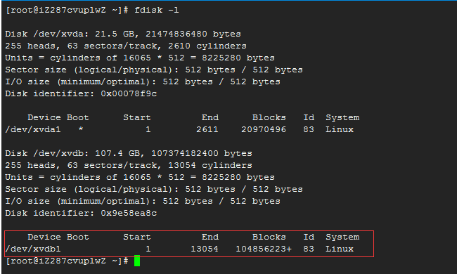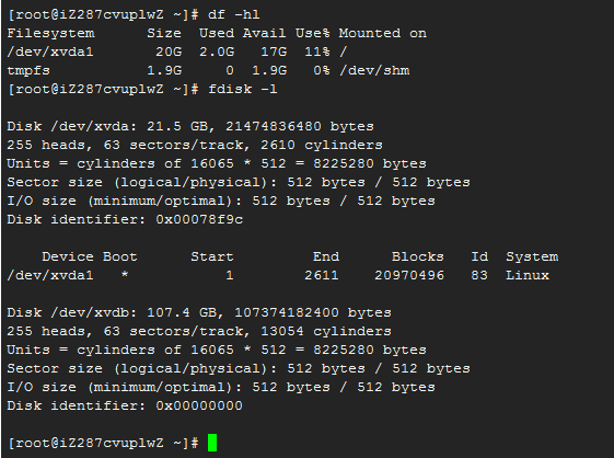 其中/dev/xvda为系统盘,/dev/xvdb为数据盘,数据盘暂未做任何操作,要使用的话,先做挂载
