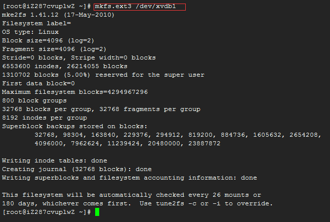 紧接着输入命令mkfs.ext3 /dev/xvdb1,格式化磁盘,耐心等待即可