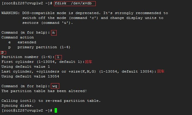 输入fdisk /dev/xvdb 对数据盘进行分区。根据提示,输入 n, p, 1, 回车,回车, wq