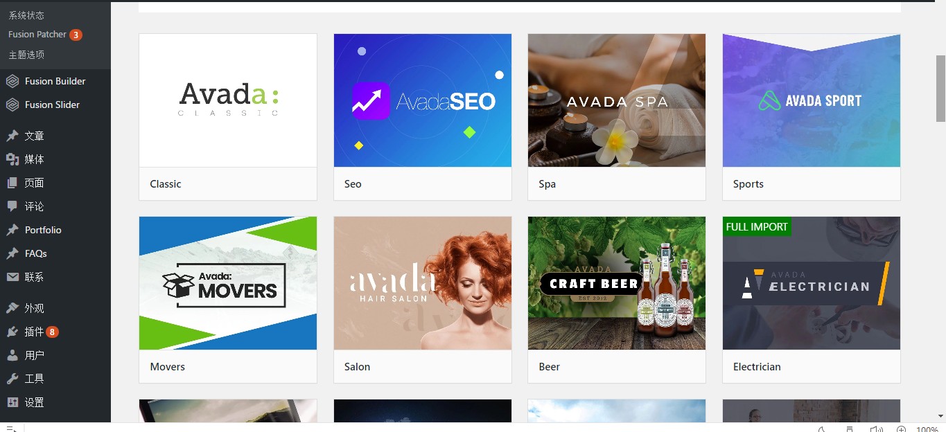1、进入wordpress后台,选择Avada-demos选项。