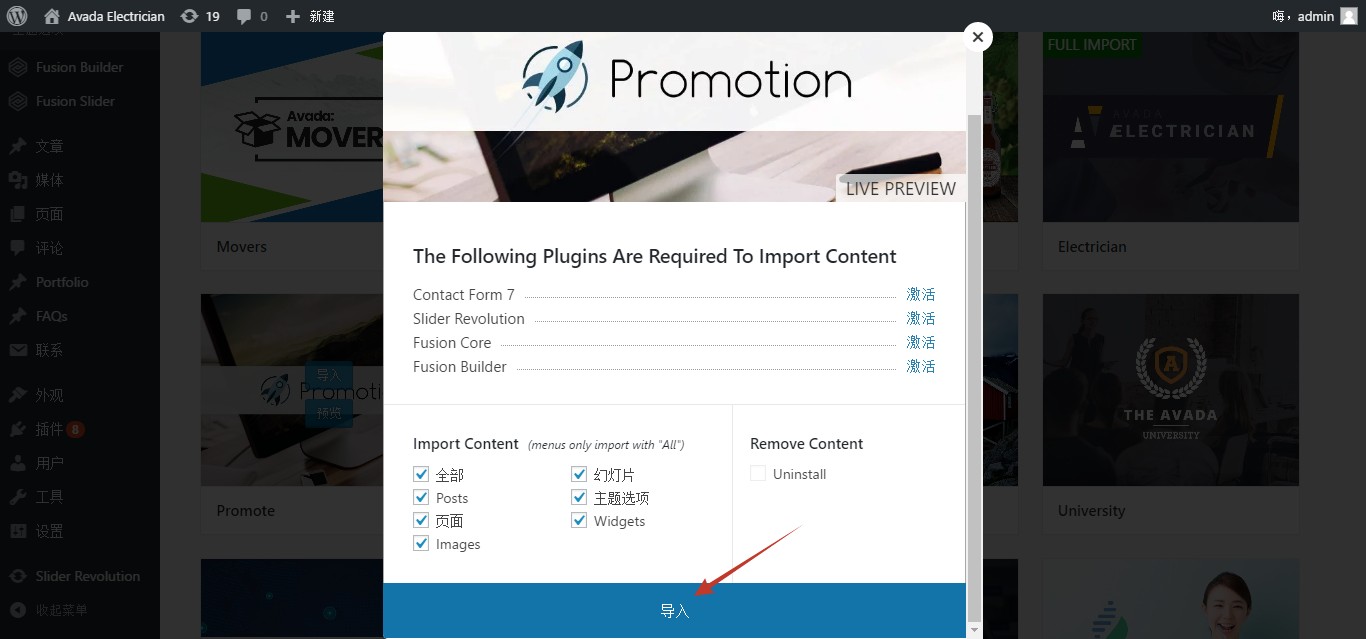 wordpress建站Avada主题如何导入demo演示站数据