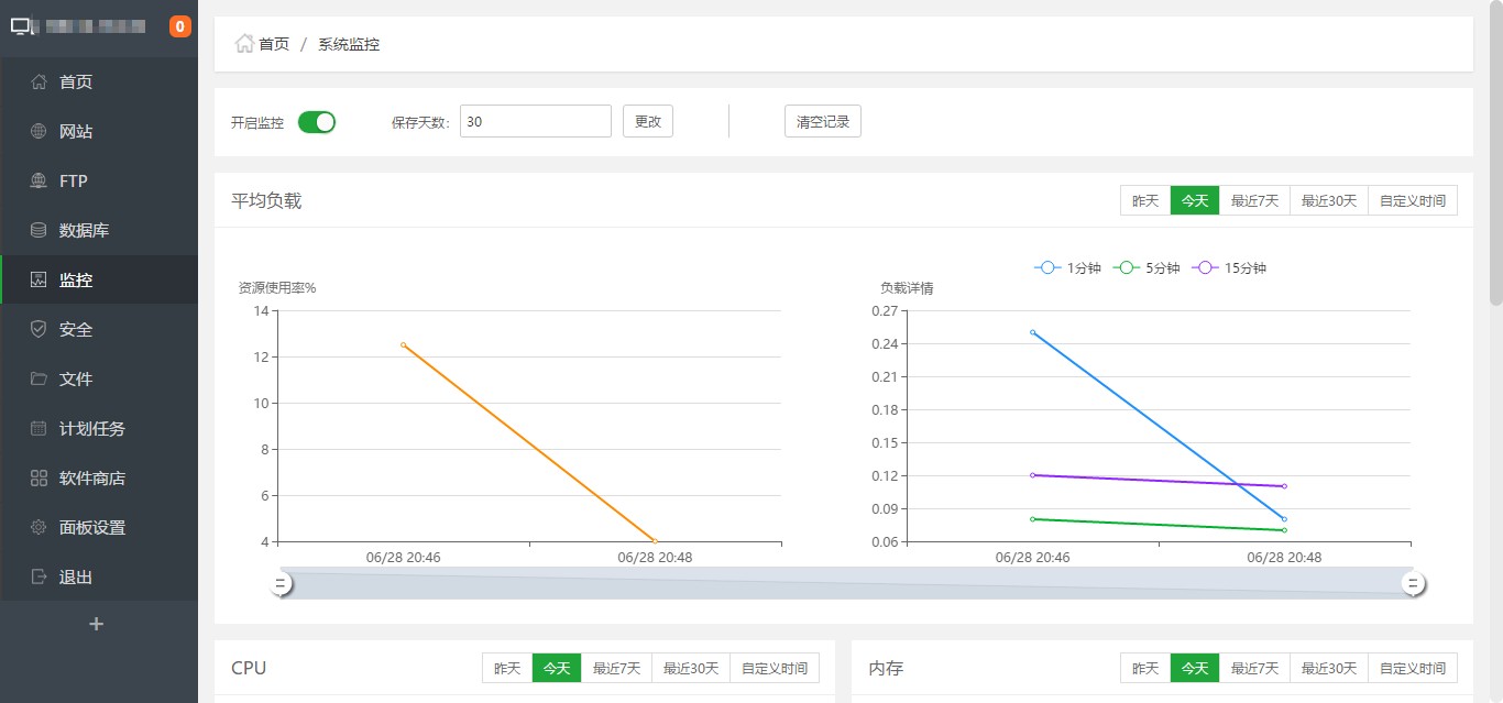 我们登陆宝塔后台可以看到有个菜单为监控,可以监测服务器的运行状态等参数,比如平均负载,资源使用率,网络IO,磁盘IO,内存占用等情况。