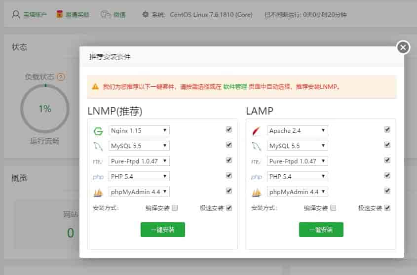 新手首次进入宝塔后台,推荐的组合是LNMP,安装方式有 编译安装和 快速安装。两者有何区别呢?