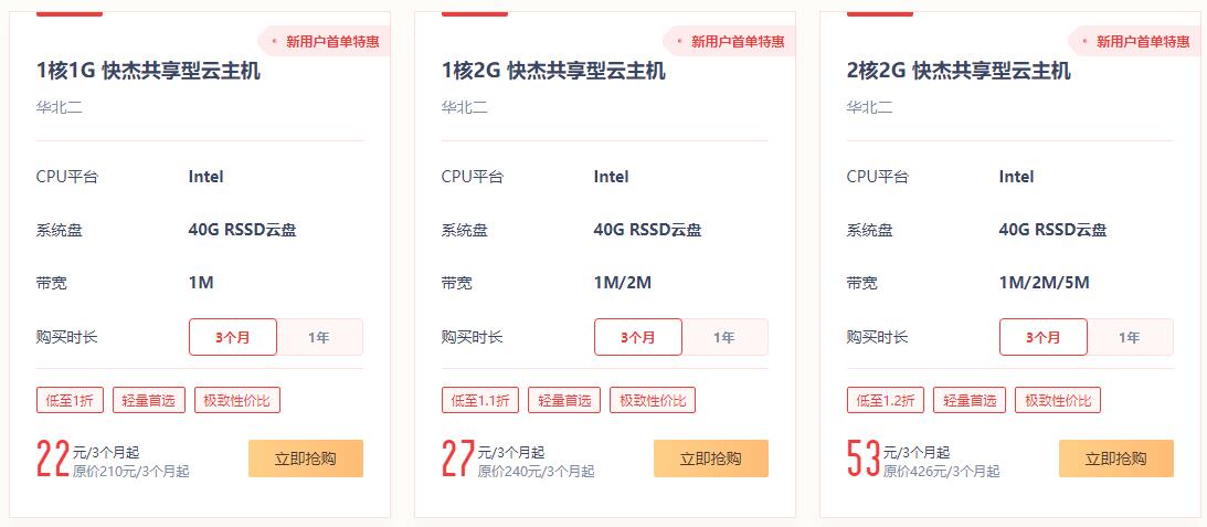 1、个人新用户专区,2核2G 快杰共享型云主机,40G RSSD云盘,213元/1年起,2核4G 340元/1年起,企业级云服务器,100%CPU性能,限首次购买云服务器的用户。每用户限购1台