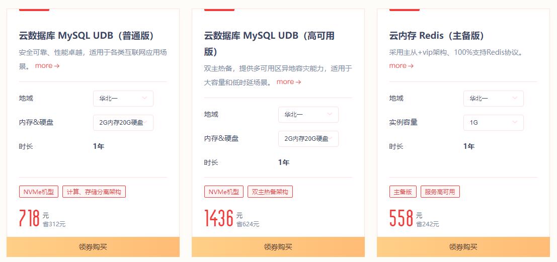 2、爆款云数据库限时特惠,高性能、高可用的云数据库产品限时特惠,新老用户同享,各产品限购1次,云数据库 MySQL UDB(高可用版)1436 元/年,云内存 Redis(主备版),采用主从+vip架构、100%支持Redis协议 558 元/年