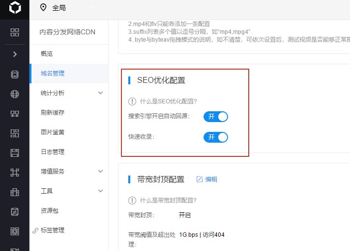 比如他的cdn产品后台会显示seo优化之类的选项,开启搜索引擎自动回源和提速收录的选项。开启对应按钮,搜索引擎访问IP将直接访问回源,对应域名日志数据可完成快速收录,内网接入百度搜索Spider数据库,平均24小时内极速收录;这大概是百度为了卖自己的云产品所以这样说的吧,个人不太相信能带来明显的seo优待的。