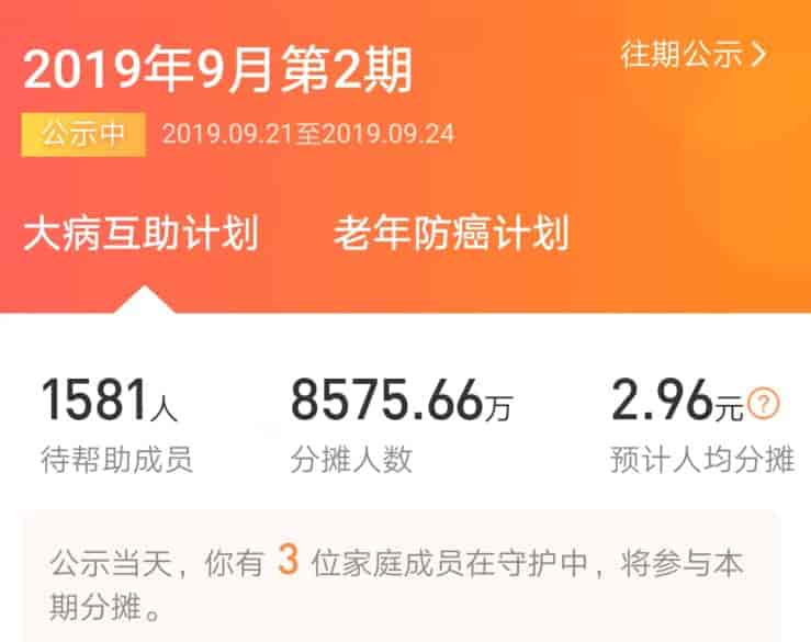 9月20日支付宝大病互助平台“相互宝”公布了其预测的2019年人均分摊金额30元。2018年底,相互宝曾承诺2019年的人均分摊金额不会超过188元,超过部分由蚂蚁金服承担,所以一般看来人均的每年支付金额大概也就是几十百来块钱