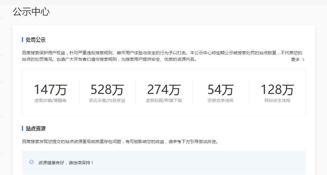 百度搜索保护用户权益,针对严重违反搜索规则、破坏用户体验与安全的行为予以打击。本公示中心将定期公示被搜索处罚的站点数量,不代表您的站点的处罚情况。也请广大开发者们遵守搜索规则,为搜索用户提供安全、优质的资源内容。打击的主要方向有:虚假X_X/黄赌毒,恶劣采集/内容受益,虚假标题/欺骗下载,恶意竞争违规,网站安全违规;