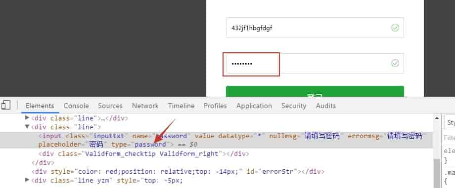 其实操作很简单,道理也很简单,当然适用性也相对比较普遍和广泛的,我们只需要查看网页审查元素,然后找到密码输入框的html代码区块,其中一半输入密码都是password的文本类型,你只需要手动把type="password"这个改成一下的这种类型 type="text",我们平时显示的密码,浏览器默认给你显示成了星号或者是点号这种形式的。
