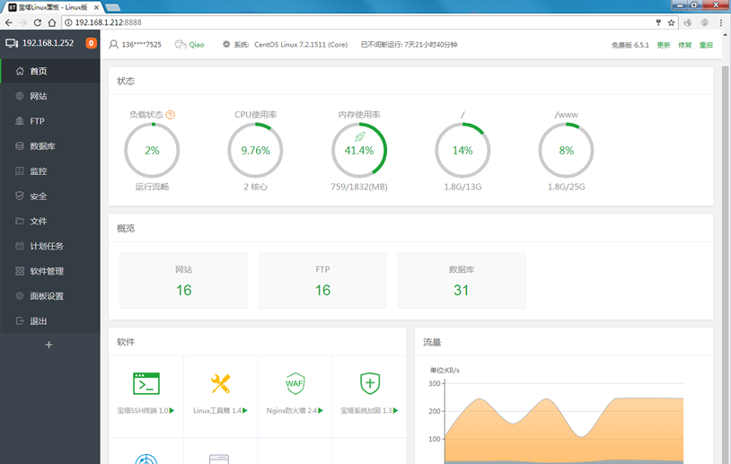 宝塔Linux面板是提升运维效率的服务器管理软件,支持一键LAMP/LNMP/集群/监控/网站/FTP/数据库/JAVA等100多项服务器管理功能。