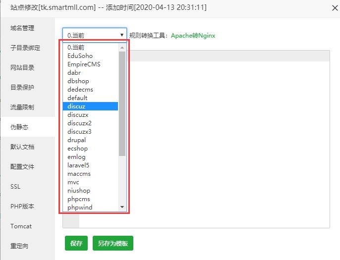 比如WordPress网站,我们可以直接选择WordPress就会显示WordPress的伪静态规则,直接保存即可轻松开启伪静态。
