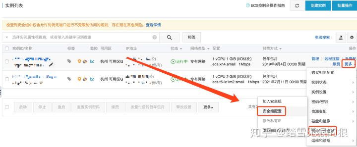 2、先找到需要操作的目标实例,点击“更多”--“网络和安全组”--“安全组配置”