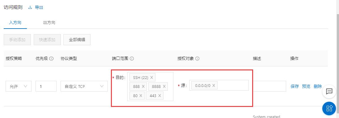 开放方式非常的简单,我们安装好宝塔之后,以阿里云为例,只需要在阿里云后台安全组中开启888端口即可,一般我们需要开放的端口大概是这几个常用的端口,可以一并开放。例如:888,8888,80,443,22,21等端口。