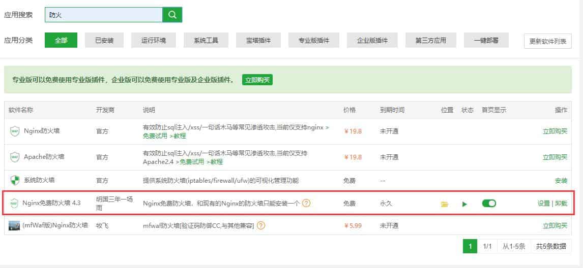 2、在软件商店中搜索防火墙,然后可以看到有个Nginx防火墙,所以你的服务器最好是安装Nginx服务。然后直接0元购买这个防火墙,安装好之后就可以开启网站的防CC攻击了。
