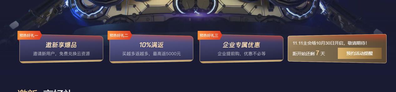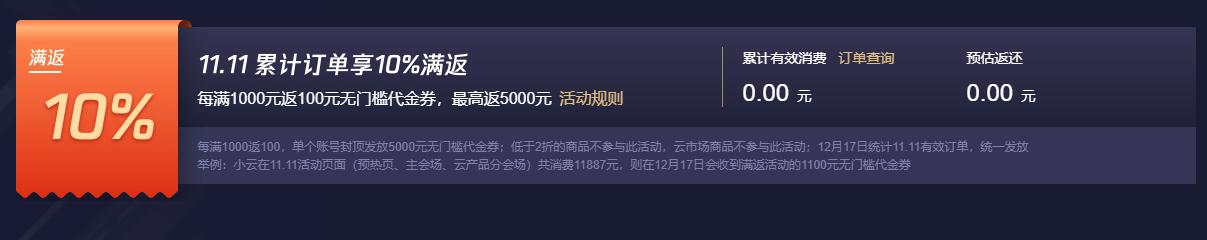 2、10%满返,买的多返的多,每满1000返100,单个账号封顶发放5000元无门槛代金券;低于2折的商品不参与此活动,云市场商品不参与此活动;12月17日统计11.11有效订单,统一发放举例:小云在11.11活动页面(预热页、主会场、云产品分会场)共消费11887元,则在12月17日会收到满返活动的1100元无门槛代金券。