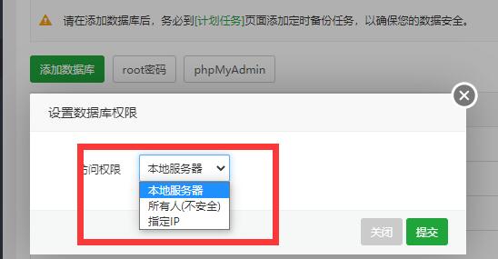 其次我们需要设置这个数据库的权限,在宝塔-数据库-权限,一般设置指定IP可访问,设置中设置相关的权限一般就是直接修改提交即可。