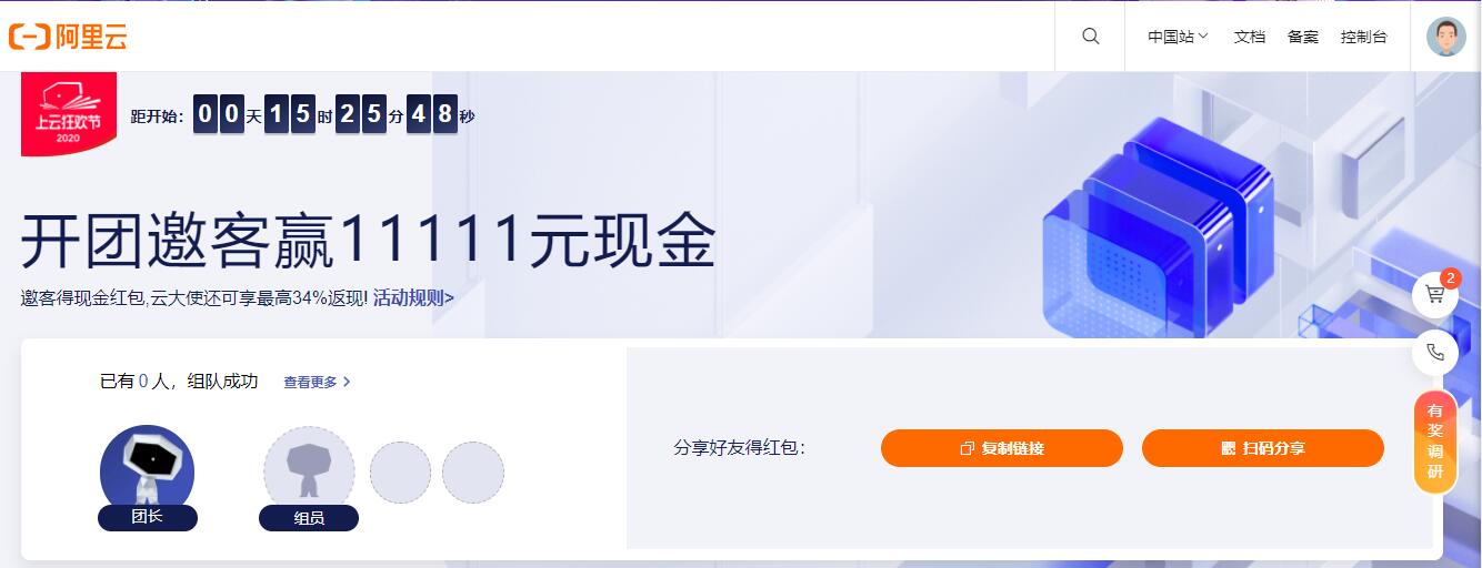 阿里云双11拼团赢万元现金红包活动地址,开团邀新老客户得现金红包,加入云大使同享最高34%返现,红包不限量 + 佣金最高34% + 订单激励5万元奖金。